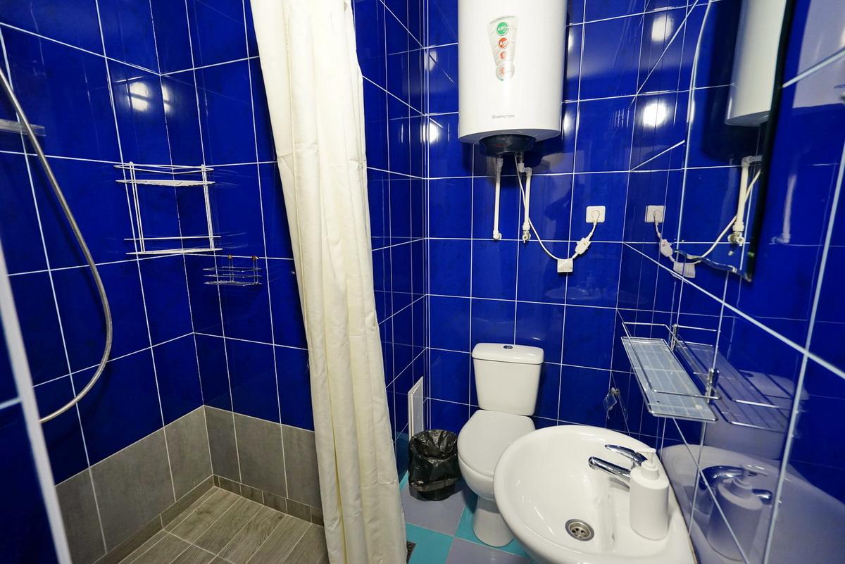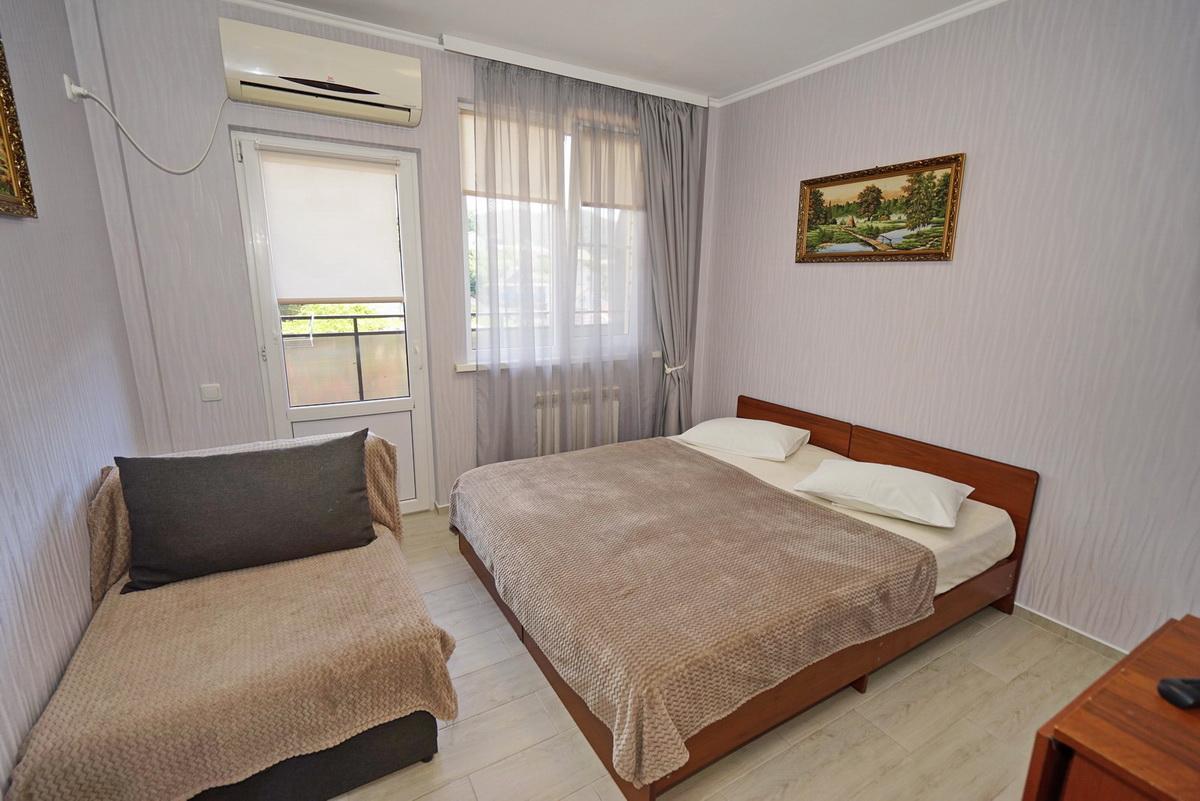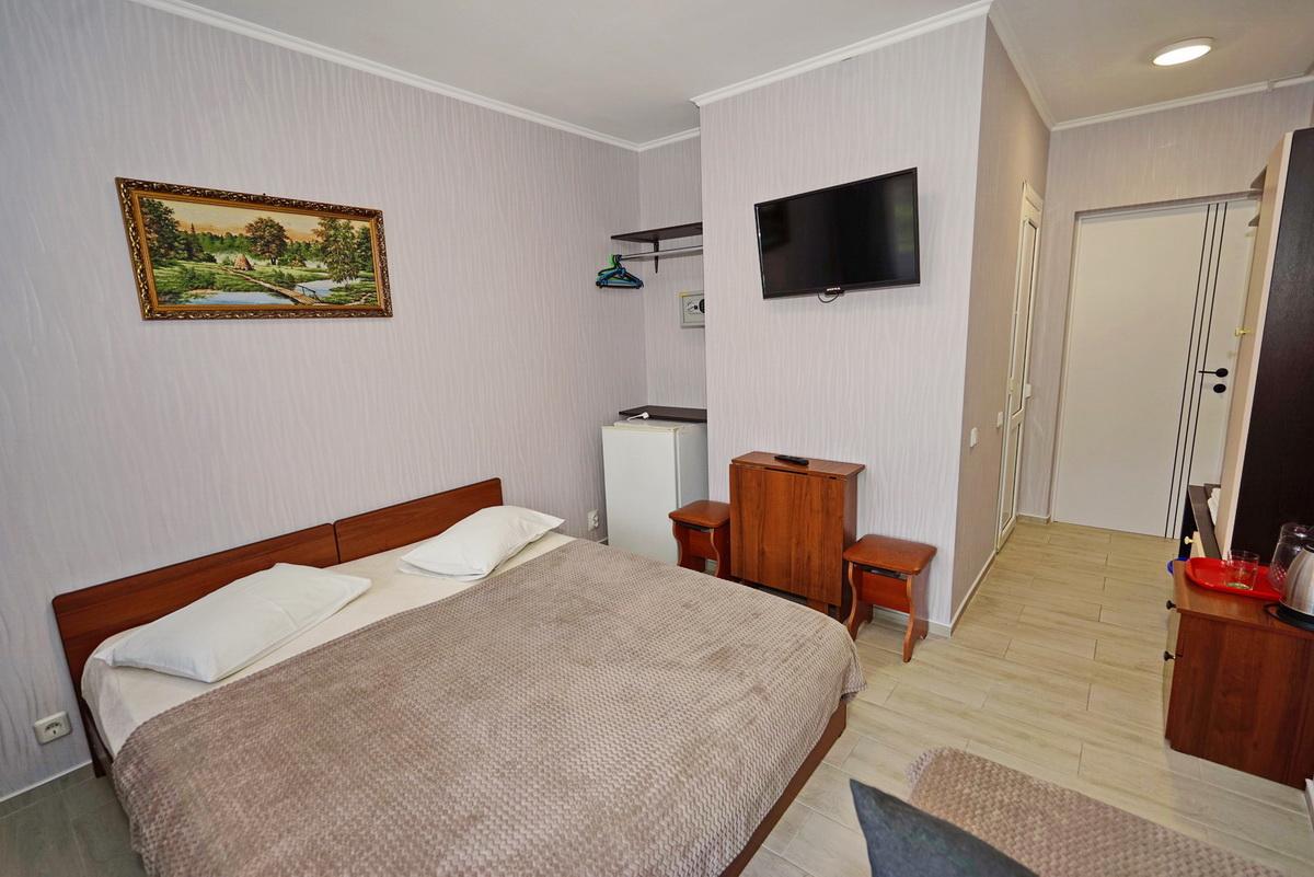 3 места 15 м2,  1 комната Душ и туалет в номере Холодильник Телевизор Балкон Кондиционер Номера находятся на втором и третьем этаже, в сторону бассейна. В стандартных номерах имеются: холодильник, сейф, кондиционер, телевизор (поддерживает устройство USB), туалет, душ, прихожая, двуспальная кровать, кресло кровать, Wi-Fi, балкон. Предоставляются полотенца (ручные и ножные). Постельное белье. Фен и чайник по просьбе. Балкон. На балконе стол, стулья, сушка для белья. Время заезда: 14:00 Время выезда: 12:00